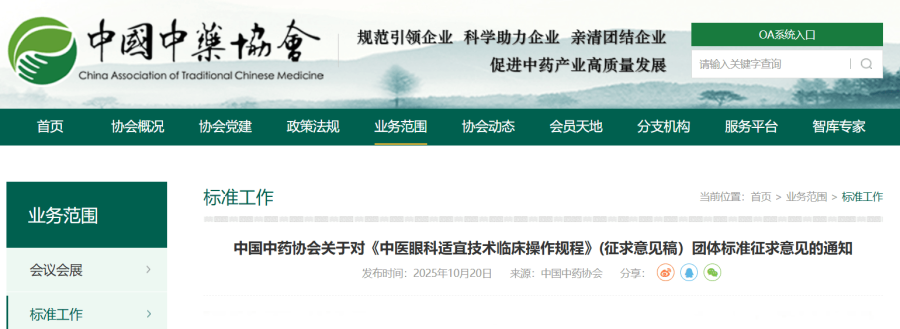 10月20日,中国中药协会发布通知,就《中医眼科适宜技术临床操作规程》团体标准公开征求意见。该标准由中日友好医院牵头,联合全国26家医疗机构共同起草,旨在系统规范中医眼科适宜技术的临床应用,提升服务质量与安全性,推动中医药在眼健康领域的科学化、标准化发展。