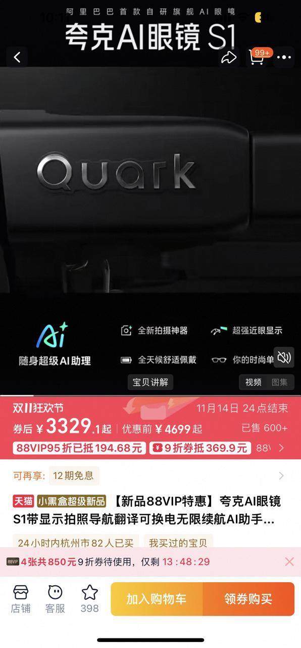 夸克AI眼镜开售,88VIP叠加9折消费券,最低3329元