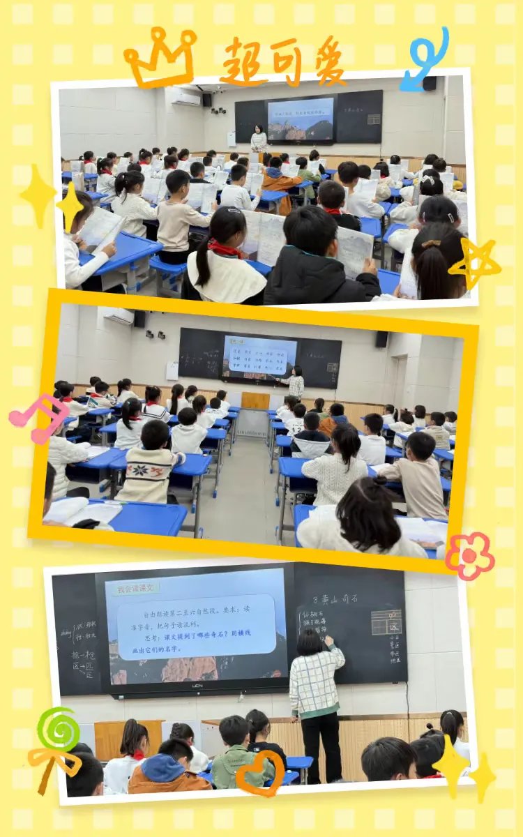 在《黄山奇石》的课堂上,二三班的孩子们跟着李青青老师开启一场趣味识字之旅。李老师巧妙运用多种识字方法引导孩子们探索。在认识学习“状”字时,她通过对比“形状”“形态”等词语,以及与同音字“壮”的对比,帮助学生理解字义。最精彩的是“指”字的教学——当屏幕上出现“仙人指路”的奇石图片,孩子们不约而同地模仿起
