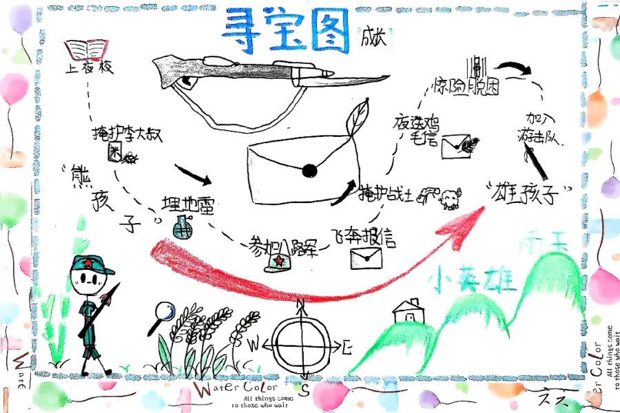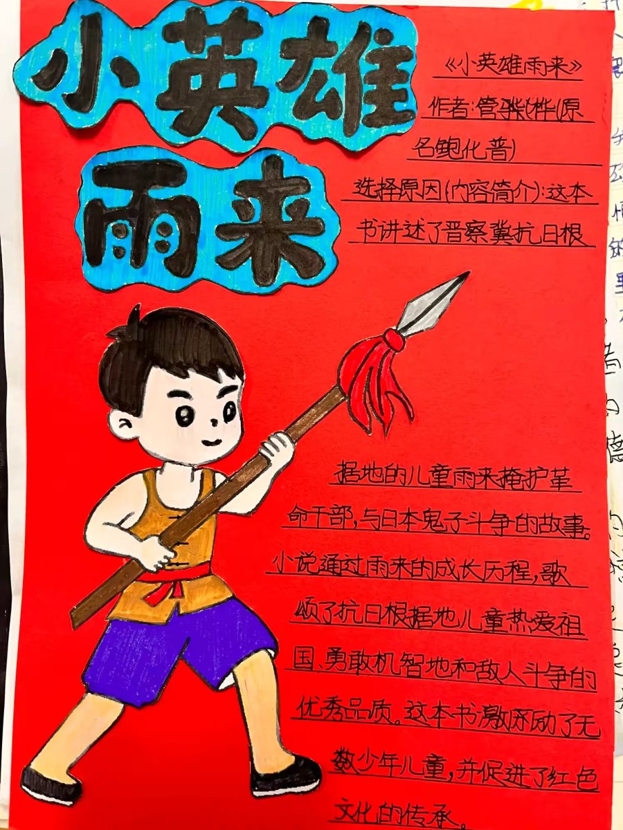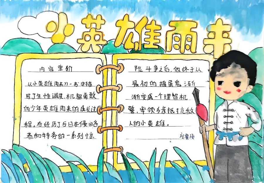 《小英雄雨来》以多种艺术形式呈现,从书本封面到主题海报,学生们通过图文再现雨来机智勇敢的形象,在抗日故事中汲取爱国情怀与担当精神。