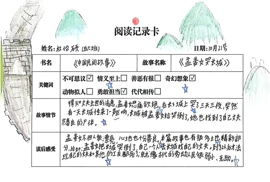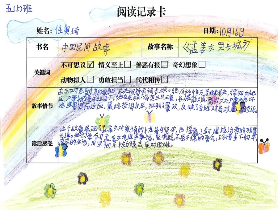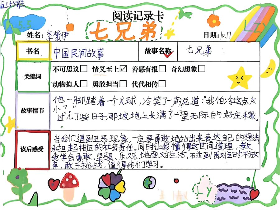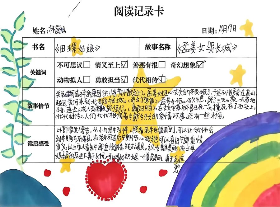 阅读记录卡承载着学生的阅读足迹,从《七兄弟》到《田螺姑娘》,从关键词提炼到感悟书写,每一页都是思维的成长印记,见证着阅读的真实发生。