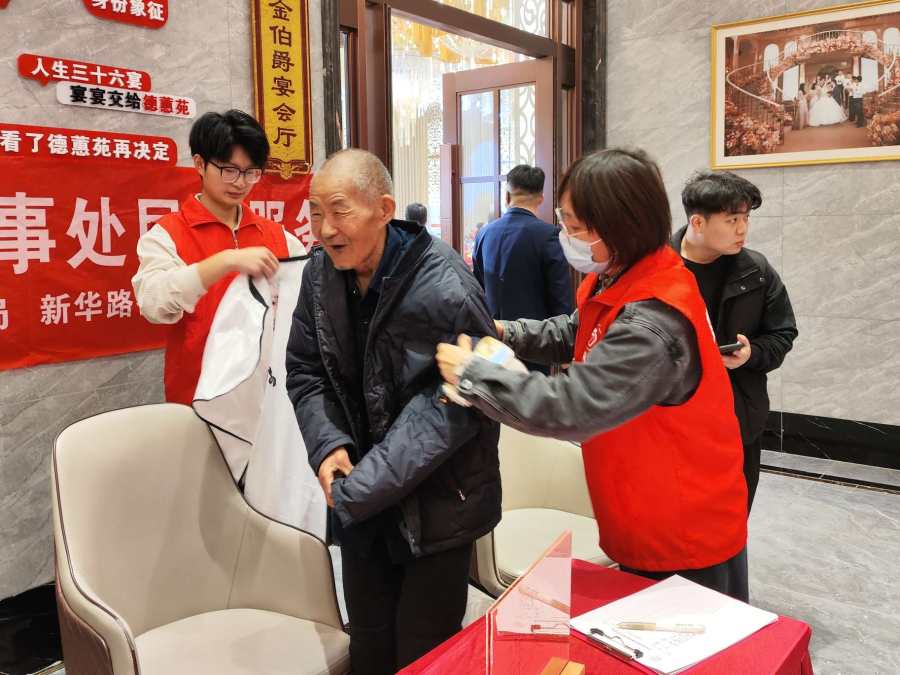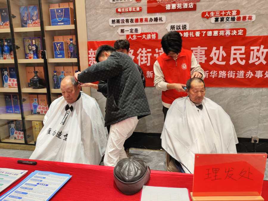 “大爷,您看这发型长度合适不?要不要再修短一点?”理发环节中,理发师们全程保持耐心细致,主动询问老人需求。遇到行动不便的老人,他们主动上前搀扶入座;面对听力欠佳的老人,便放慢语速,反复确认发型长度和样式。82岁的高大爷理完发后,对着镜子摸了摸头发,笑着对理发师说:“剪得真精神!谢谢你们。”
