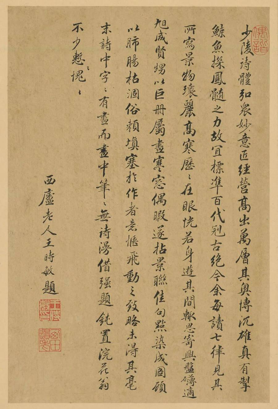 少陵诗体弘众妙,意匠经营,高出万层。其奥博沉雄,真有掣鲸鱼探凤髓之力。故宜标准百代,冠古绝今。余每读七律,见其所写物,瓌丽高寒,历历在眼,恍若身游其间,辄思寄兴盘礴。适旭咸甥以巨册属画,寒窗偶暇,遂拈景联佳句,点染成图。顾以肺肠枯涸俗赖,填塞于作者意惬飞动之致,略未得其毫末,诗中字字有画,而画中笔笔无诗。漫借强题,钝置浣花翁不少,惭惭愧愧。西庐老人王时敏题。