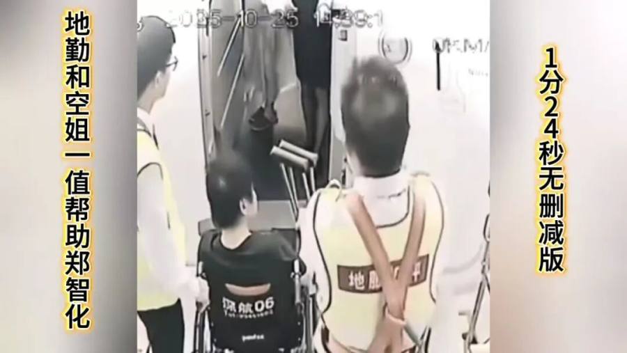 然后就是郑智化比较费劲地尝试登机,过程中身旁的工作人员一直有搀扶,并且还帮忙把郑智化的腿放到飞机上;同时,机内的空乘人员也有帮忙搀扶;