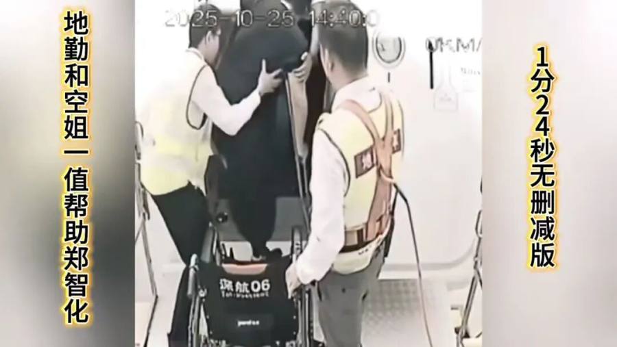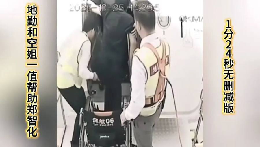 根据这段视频再来对比10月25日郑智化发的微博,则可看出:首先确实升降车与飞机之间存在比较高的落差,不方便轮椅通行;其次,视频里最终轮椅并未上机,并且轮椅背后印有“深航”字样,疑似是深圳航空资产。