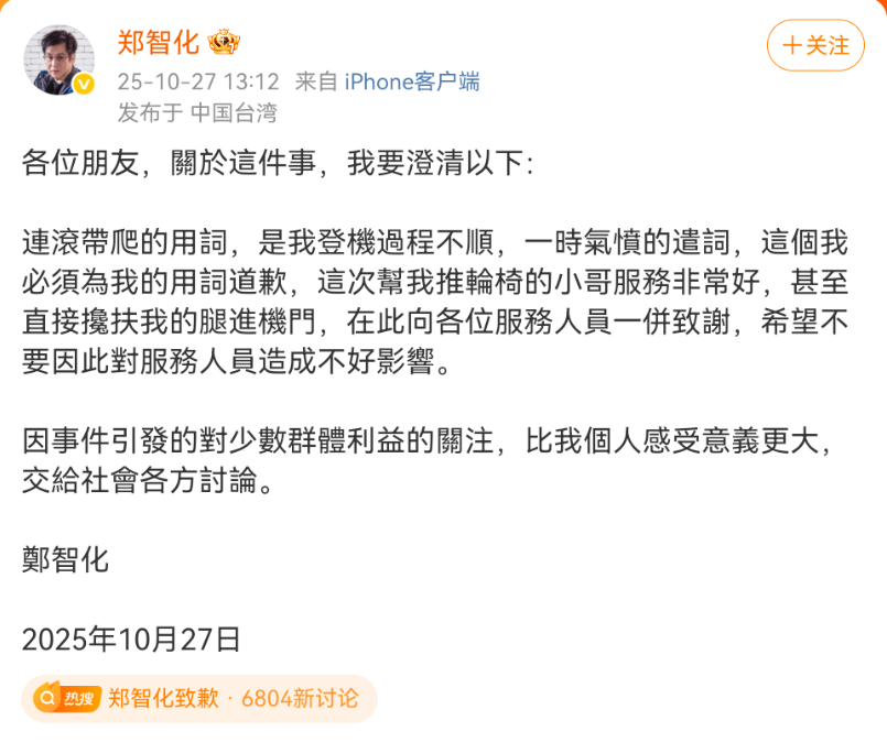 今天下午,郑智化再次发微博致歉,他表示“连滚带爬”的用词是登机过程不顺,一时气愤。所以对自己用词道歉,并表示“这次帮我推轮椅的小哥服务非常好,甚至直接搀扶我的腿进机门”,他还向各位服务人员一并致谢。