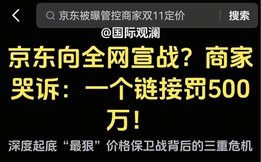 京东向全网宣战?商家哭诉:一个链接罚500万;京东慌了?今年双11把二选一玩出了新套路;京东急眼了!下令要求商家“不准提比我家便宜”……近日,抖音出现了大量关于京东双11政策的视频,“双11京东被吐槽二选一玩出新高度”成为抖音热门话题。