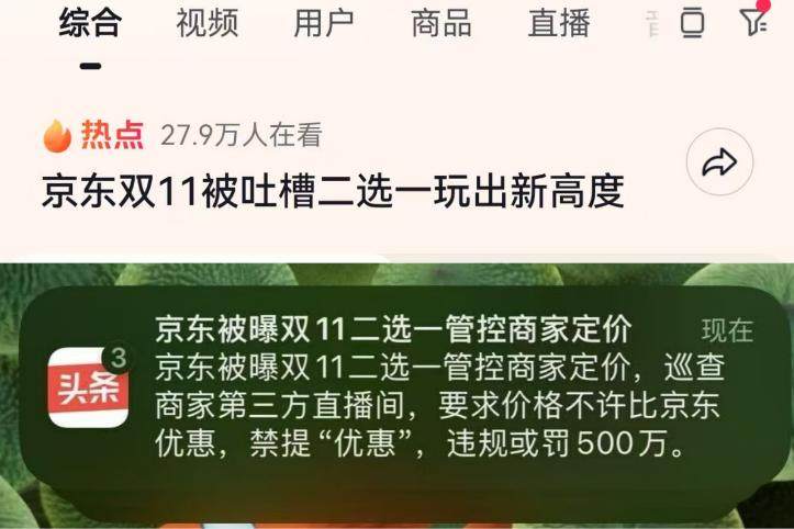 此外,今日头条还推送了“京东被曝双11二选一管控商家定价”的文章。