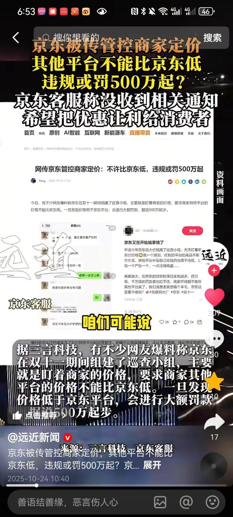 此外,还有视频称京东慌了,正常竞争打不过,所以才搞“二选一”。有的视频甚至称,京东向全网宣战,一条链接被京东罚500万。