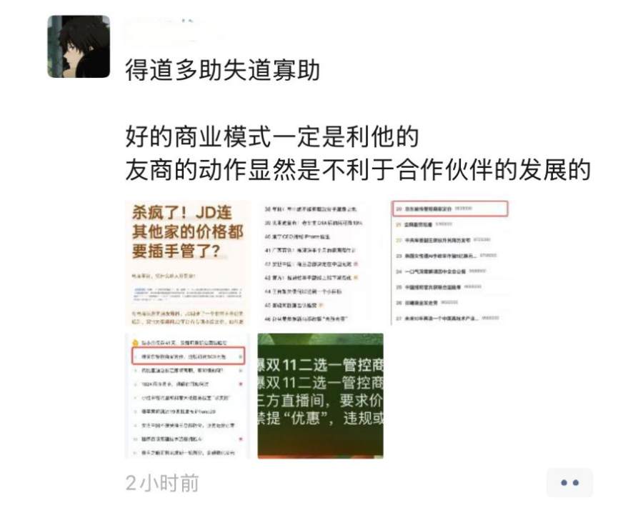 事实上,此次流传出来的只是真假难明的截图。即使截图为真,也只是一些采销为了给消费者争取低价的行为,而非京东利用市场支配地位去限制商家。