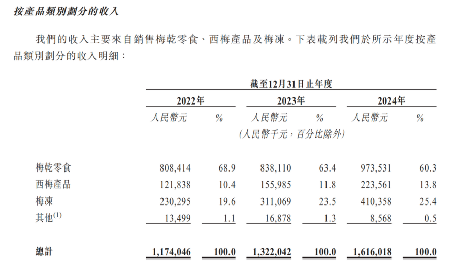 除了三大品类,溜溜果园还有梅味调味品、梅茶茶汤等产品,营收占比不到1%,尚未形成规模效应。