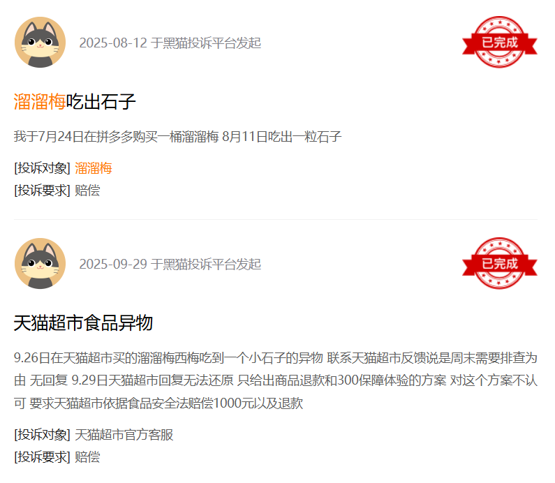 值得关注的是,营销并未掩盖质量隐患。在黑猫投诉平台上,共有464条投诉中包含搜索词“溜溜梅”,其中多条直指有异物、有怪味等质量问题。