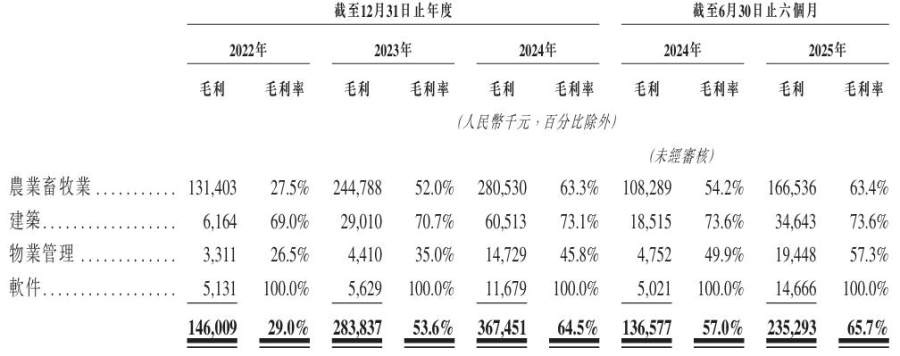目前,农业畜牧业依旧是丰疆智能的主要创收来源,2022年、2023年、2024年度和2025年上半年(同“报告期”)来自该领域的收入分别为4.77亿元、4.70亿元、4.43亿元和2.63亿元,占总收入的比例稳定在七成以上。
