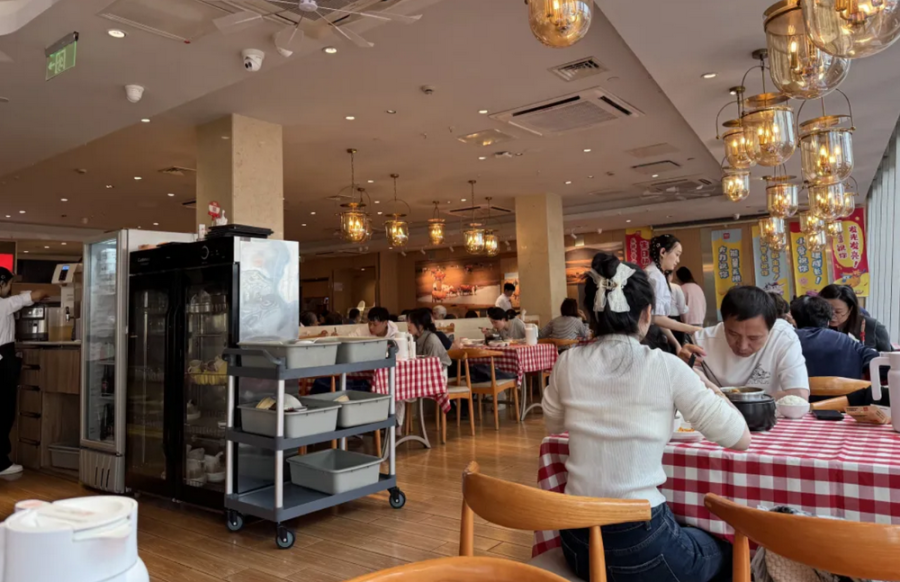 记者观察发现,工作日午市的客群以周边写字楼的职场人为主,三三两两结伴而来。靠窗的长桌更有十几人的公司团队正在聚餐。