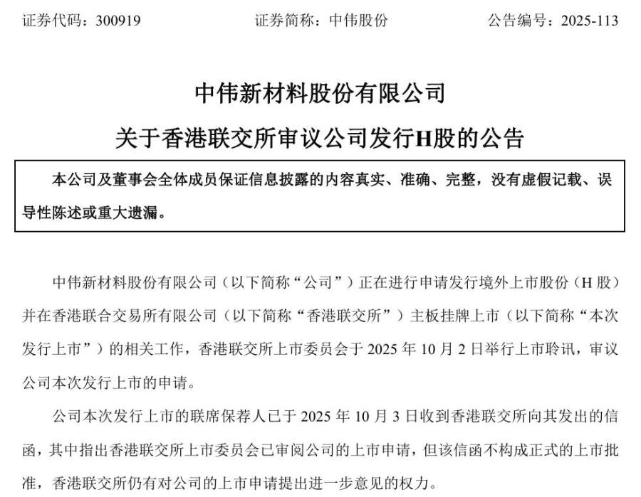 近日,贝多商业&贝多财经注意到,A股上市新能源材料公司中伟新材料股份有限公司(300919.SZ,下称“中伟股份”)于2025年10月23日在港交所更新了上市申请资料,摩根士丹利、华泰国际为其联席保荐人。