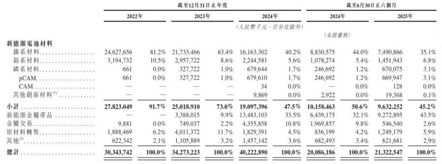 相比之下,中伟股份的新能源金属产品收入由2023年33.88亿元翻倍增至2024年的134.83亿元,收入贡献直接占到三分之一以上;2025年上半年该公司的收入亦实现了44.0%的增长,来到92.73亿元,占比与新能源电池材料旗鼓相当。