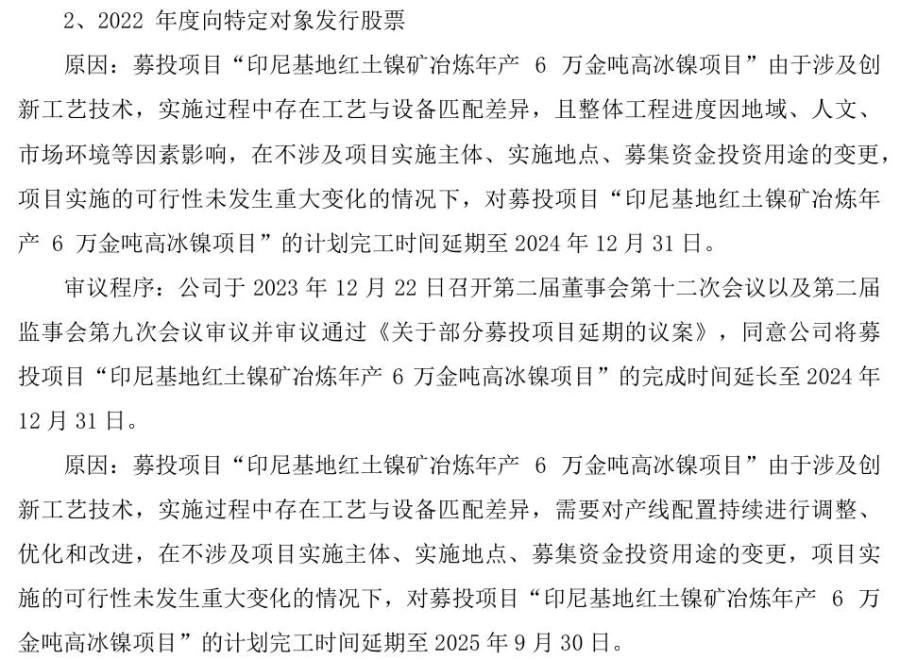 然而,中伟股份的募投项目进展却并不顺利,该公司于2024年12月宣布将“印尼基地红土镍矿冶炼年产6万金吨高冰镍项目”的计划完工时间由2024年12月31日延长至2025年9月30日,而这已是该项目第二次延期。
