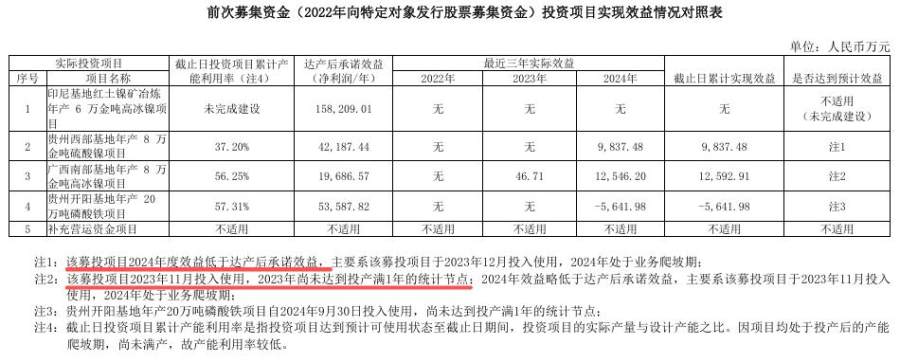 中伟股份还在报告中坦言,其“贵州西部基地年产8万金吨硫酸镍项目”和“广西南部基地年产8万金吨高冰镍项目”均未达到预计效益,主要是由于上述项目于2023年12月投入使用,2024年处于业务爬坡期。