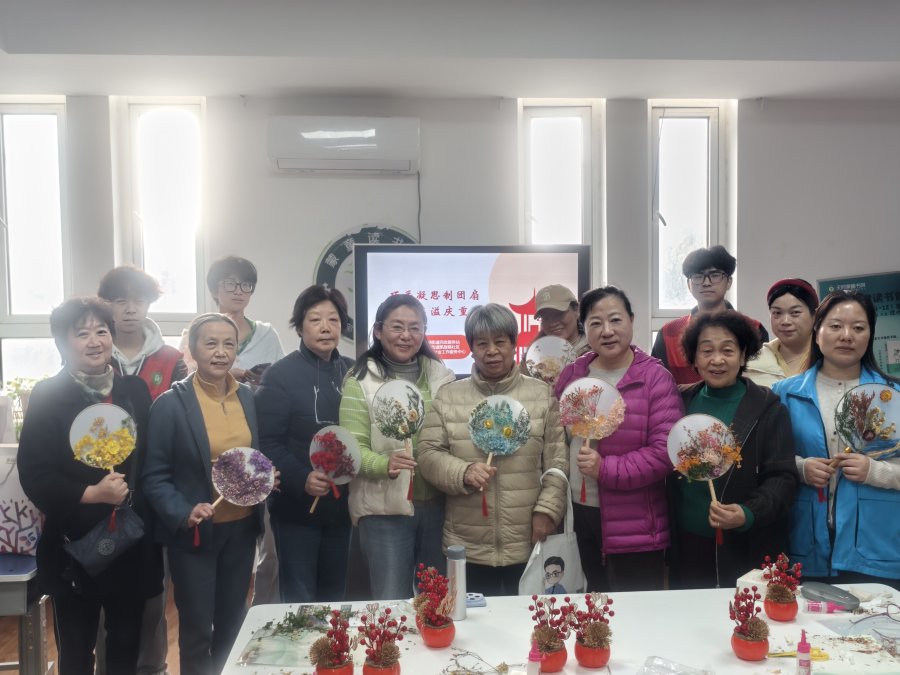 制作过程中,老人们有的仔细挑选干花,搭配出层次分明的花艺造型;有的小心翼翼涂抹酒精胶,将干花稳稳粘在宫扇上;遇到手法生疏的地方,便主动和身边同伴交流经验,或是向社工、志愿者求助。社工与志愿者们对动手不便的老人手把手协助调整花材位置、控制胶水用量,及时帮大家解决难题。活动尾声,老人们纷纷举起自己的作品,拉着同伴、社工合影留念,脸上洋溢着自豪与幸福的笑容。