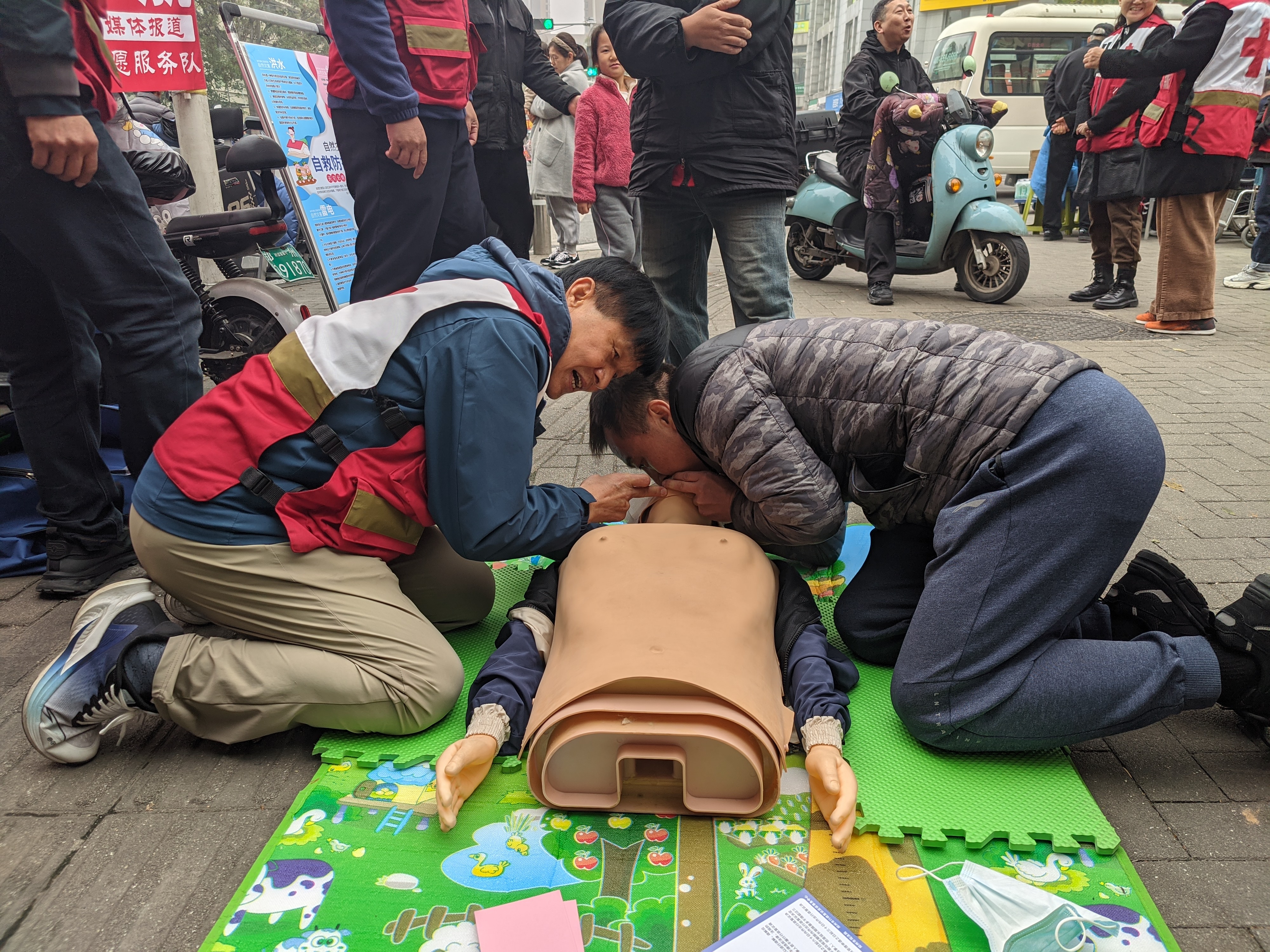 活动体验区充满了欢声笑语。老人们兴致勃勃地参与手工香囊制作,在一针一线中感受传统文化的魅力,趣味套圈游戏则吸引了同行孩童的注意,现场气氛热烈,其乐融融。特别值得一提的是,社区还联动郑州市红十字法律工作志愿服务队设置了急救地摊。志愿者们通过现场演示和手把手教学,向老人们及社区居民普及了心肺复苏等基本急救知识与技能,增强了大家在突发事件中的自救互救能力,为生命安全再添一道防线。