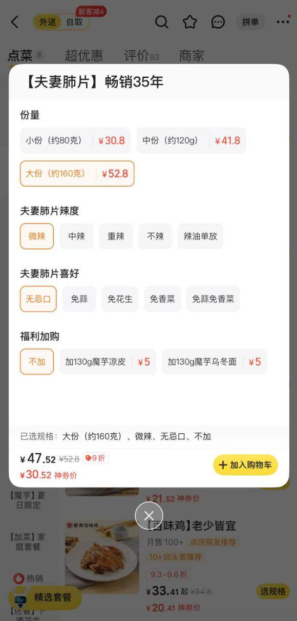 10月27日,雷达财经通过某外卖平台了解到,在紫燕的一家线上外卖店中,一份160克的夫妻肺片原价为52.8元,按此计算,其每斤价格再次上涨,达到165元。