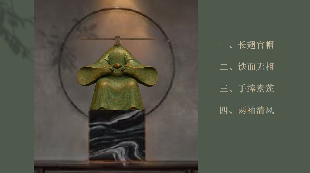 而手捧素莲与两袖清风的细节,更是将廉洁精神层次推向深入的点睛之笔。莲花“出淤泥而不染”的文化意涵,与官员“掌心向怀”的姿态结合,将“清廉操守”从外在要求内化为“珍宝般的信仰”;空灵飘逸的衣袖与沉重端正的官帽形成“一重一轻”的对比,既暗合“权力重如泰山、私欲轻如鸿毛”的辩证关系,又以艺术的张力诠释了“一身正气、两袖清风”的千古誓言。这些细节相互呼应、层层递进,共同构建起“外在约束—内在信仰—价值追求”的完整廉洁逻辑,展现出两位创作者深厚的文化底蕴与精湛的造型能力。