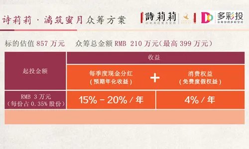 同年,度假酒店品牌诗莉莉在多彩投平台发起“阳朔诗莉莉漓筑蜜月精品度假酒店”的众筹认购,投资金额为330万元,众筹总金额为210万元。而仅在6天后,项目便筹集到399万元,达到最高限额,超出预期90%。