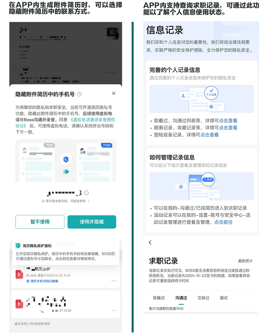 同时,前述负责人提示求职者在求职时要保护好个人隐私。例如,在生成附件简历时可选择隐藏联系方式;在“隐私保护”界面,可屏蔽特定公司、管理查看权限,并查询近三个月内与哪些BOSS交换过简历或联系方式,以了解个人信息的使用状态。