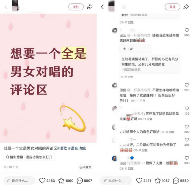 看到“进来唱两句”的帖子,点进去,在评论区一展歌喉,坐等“吃CD了吧”“姐妹,你唱的也太好听”了的夸赞,心情不好的时候还能反复浏览给心情充能,不比肉身前往KTV现场开麦、掌声转瞬即逝强多了?