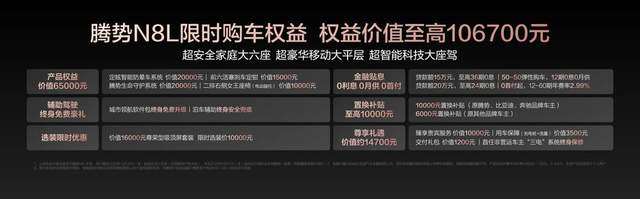 为回馈广大用户的支持与信赖,腾势N8L特别推出限时购车权益,权益价值至高10.67万元!包括价值1.7万元的三年免息,最高1万元的置换补贴。此外,不必担心因为交车晚,享受不到购置税补贴:在2025年11月30日24点前完成合同签署的用户,如果因非用户原因车辆未及时交付,导致开票实际发生在2026年,可享受购置税差额补贴,最高1.5万元!