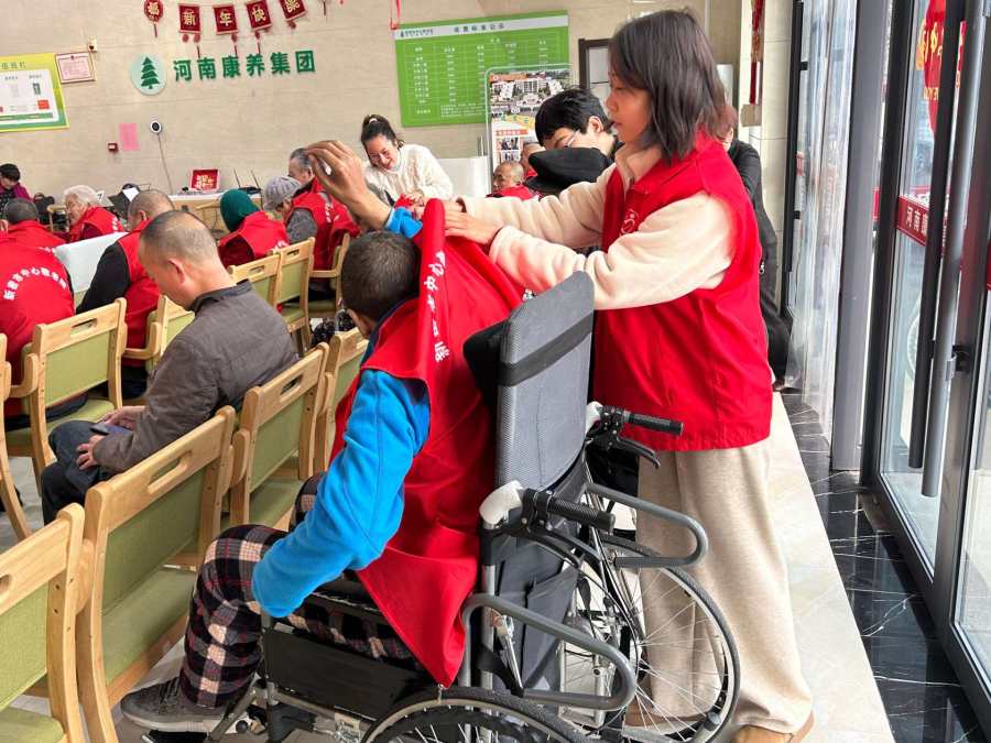 活动伊始,社工与敬老院工作人员便忙碌起来,将提前准备好、印有“中心敬老院”字样的红马甲逐一为现场老人穿上。鲜红的马甲不仅让老人们瞬间焕发出精神气,更像一团团温暖的火焰,将关爱与心意紧紧包裹在老人身边,现场氛围瞬间变得热烈而温馨。