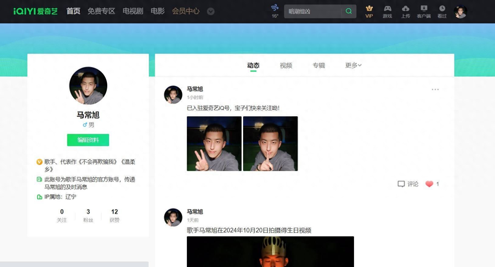 马常旭入驻爱奇艺iQ号,认证歌手身份开启新征程