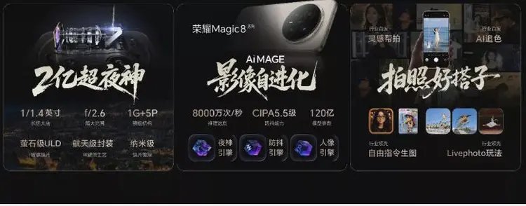 顶级影像硬件配置之外,全新荣耀AiMAGE影像系统也带来了荣耀Magic8系列影像表现进化。AiMAGE·夜神引擎,拥有8000万次/秒推理速度,精确处理明暗复杂光影;AiMAGE·防抖引擎,大幅提升陀螺仪和马达等硬件工作精度,荣耀Magic8 Pro主摄和长焦实现了CIPA 5.5级防抖能力;AiMAGE·人像引擎,高达120亿模型参数,带来肤质优化、光影还原、光斑拟真三大升级,无论日夜,都能拍出大师级人像效果。