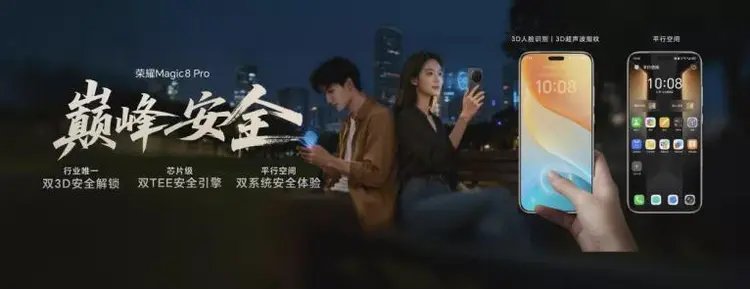 安全方面,荣耀Magic8 Pro配备行业唯一双3D安全解锁,通过欧盟支付级安全认证,加上芯片级双TEE安全引擎和平行空间双系统安全体验,隐私安全三保险;此外还有行业独家的三位一体AI反诈能力,换脸、变声、诈骗话术都能准确高效识别,荣耀的AI换脸反诈还入选了《时代周刊》2025最佳发明榜。