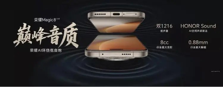 可靠性方面,荣耀Magic8系列配备荣耀巨犀玻璃,10倍抗跌耐摔,获得“SGS整机抗跌耐摔”五星认证,并支持IP68、IP69和IP69K,获满级防尘防水认证;音质方面,荣耀首创开放音腔技术,加上行业顶级双1216扬声器,搭配自研AI声场算法,带来澎湃有力的环绕低音炮巅峰音质。