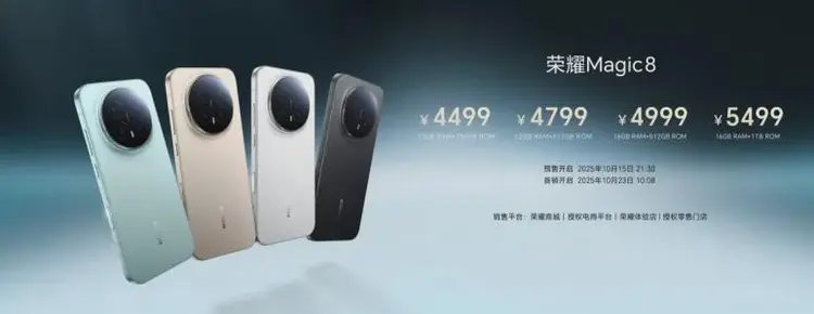 荣耀Magic8系列已于2025年10月15日正式发布,并在10月23日在荣耀官方渠道及合作平台启售。荣耀Magic8标准版配备旭日金、天青釉、雪域白、绒黑色,售价4499元起;荣耀Magic8 Pro配备旭日金砂、天青色、雪域白、绒黑色,售价5699元起。