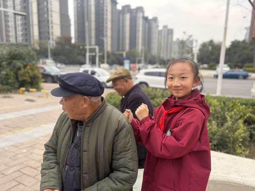 戏曲表演间隙,一抹“青春亮色”温暖全场。港区实验小学的学生们用稚嫩歌声唱响敬老祝福曲,随后列队走到老人身边,轻轻为长辈捶肩揉臂。“爷爷奶奶重阳节快乐,祝您身体健康!”甜甜的问候让老人们眼角泛起笑意,这份跨越年龄的温情互动,成为重阳佳节最动人的画面。