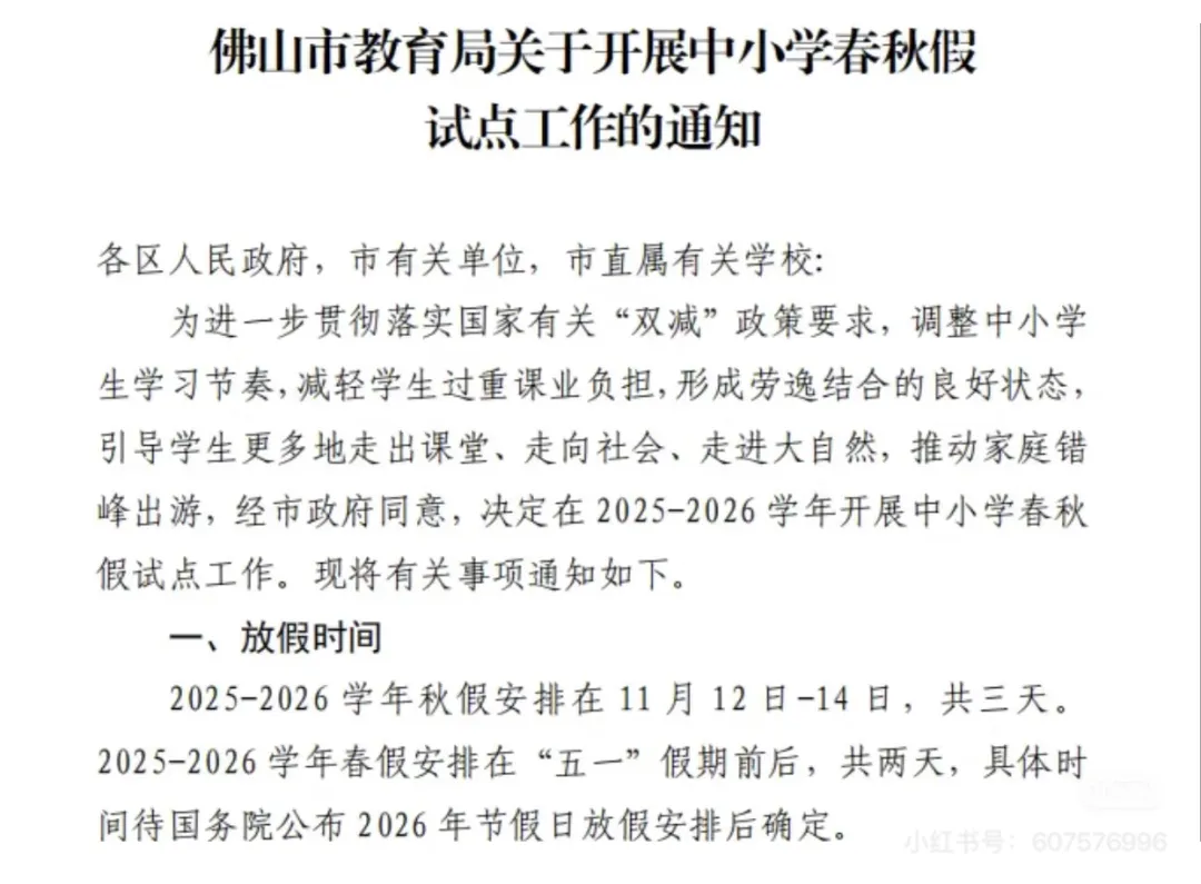 今年8月,《佛山市教育局关于开展中小学春秋假试点工作的通知》发布,根据官方安排,2025-2026学年秋假安排在11月12-14日,共三天,由于11月15和16日是周末,相当于佛山给全市中小学放了一个长达5天的公共小长假。