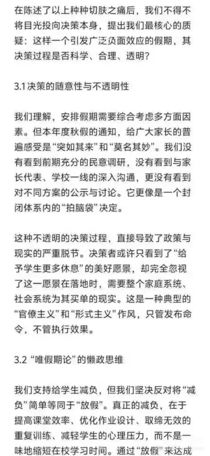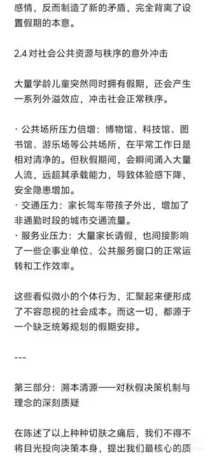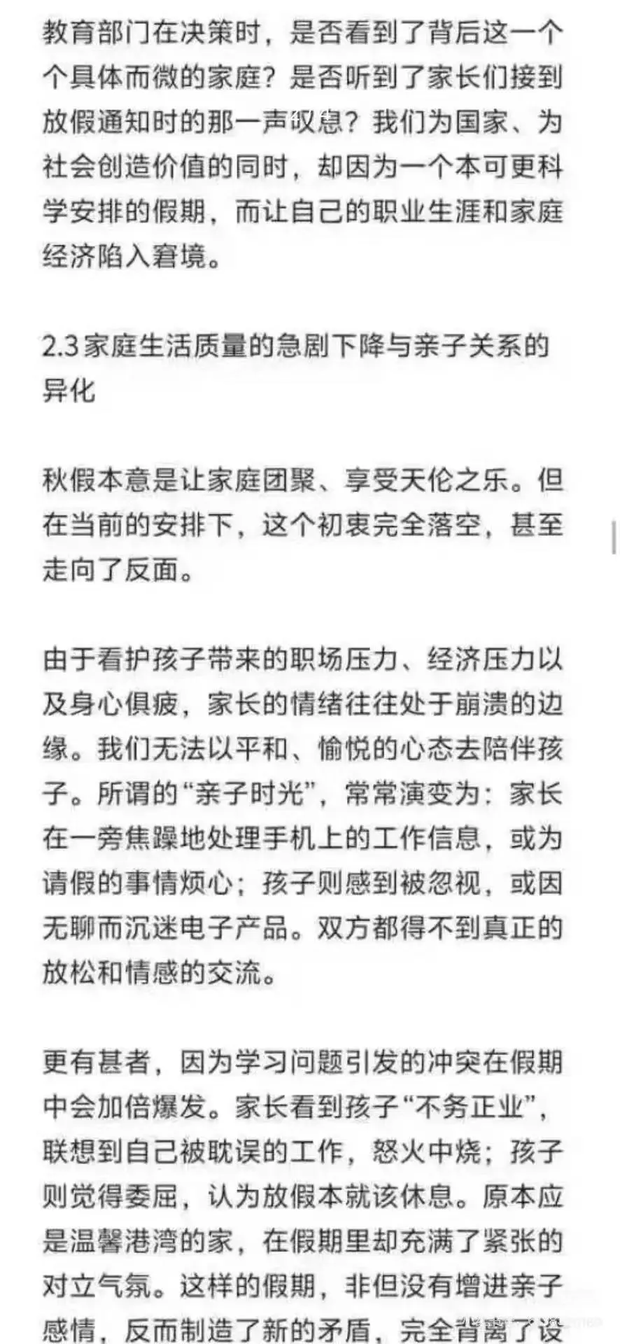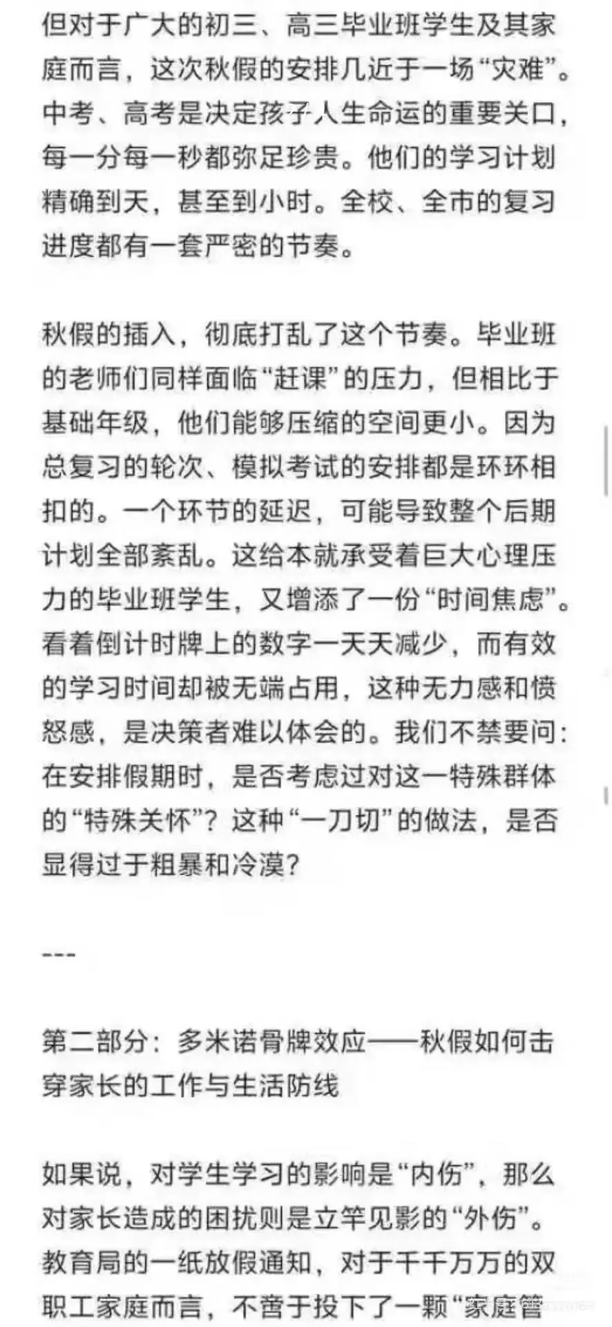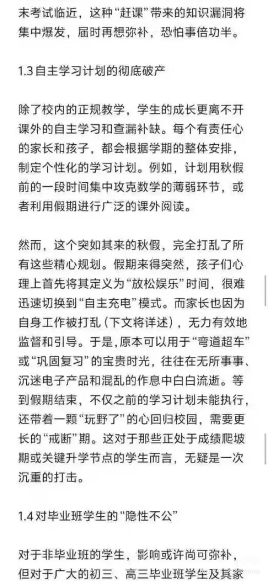 对学生学习连续性与深度的致命一击;秋假彻底击穿家长的工作与生活防线;对于秋假决策机制与理念的深刻怀疑;