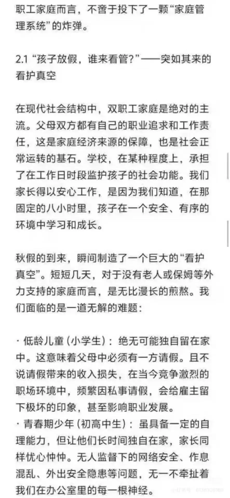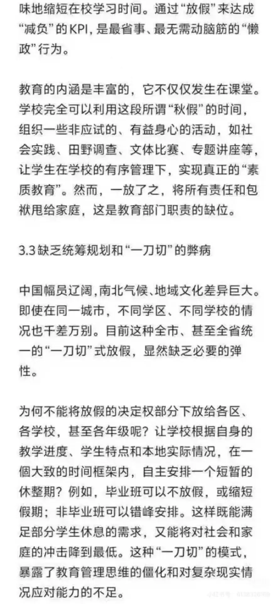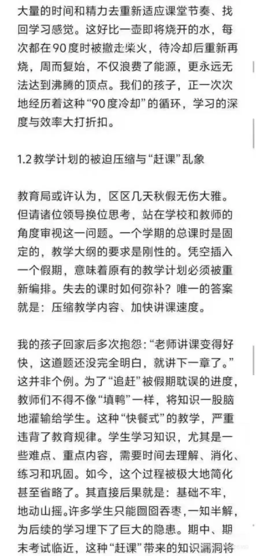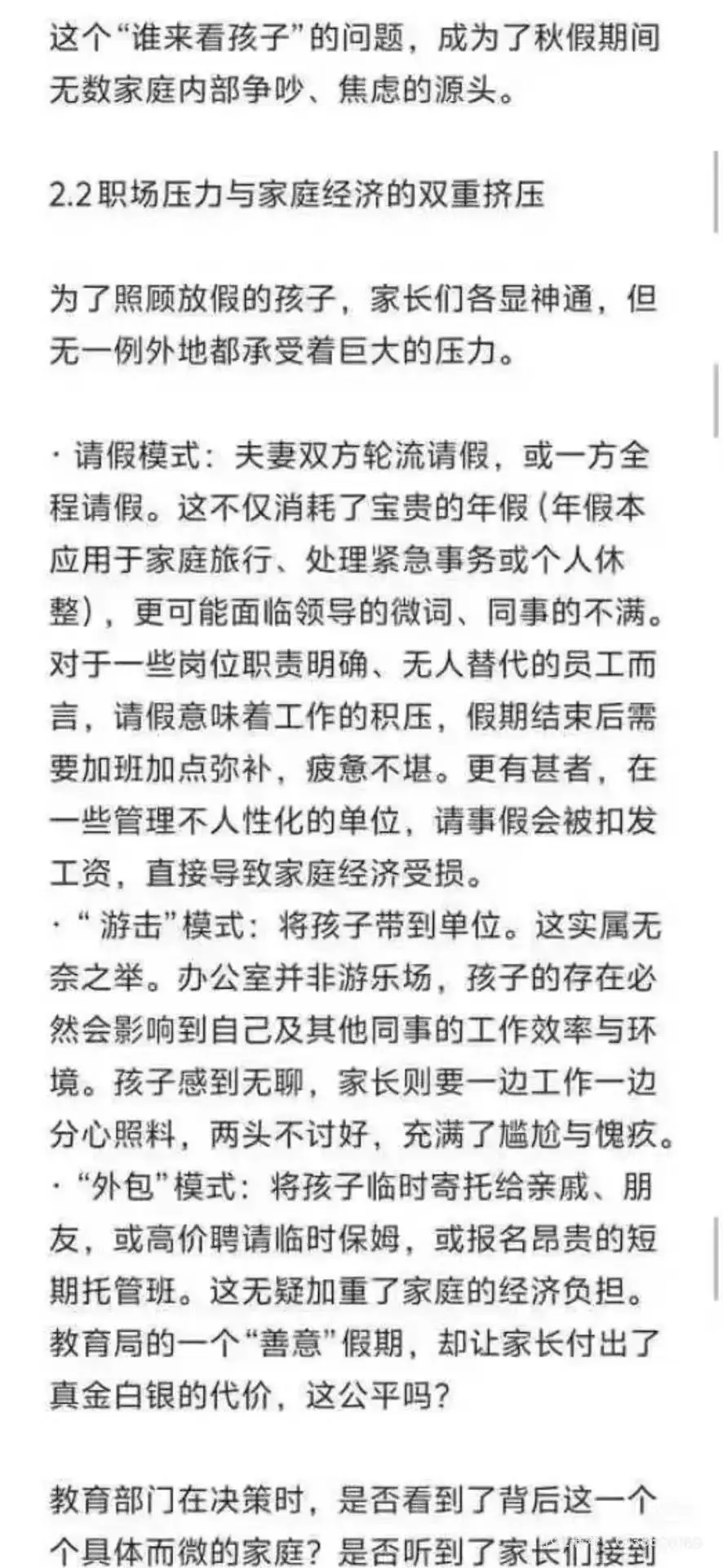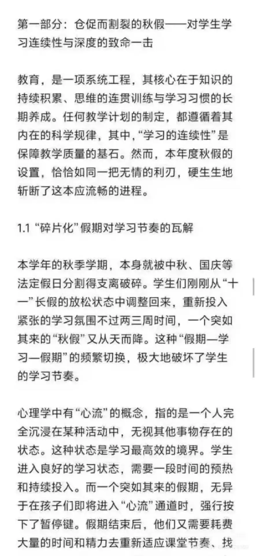 对学生学习连续性与深度的致命一击;秋假彻底击穿家长的工作与生活防线;对于秋假决策机制与理念的深刻怀疑;