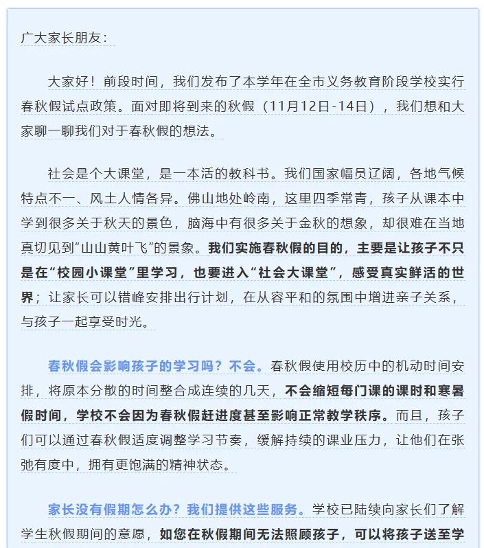 在这封《佛山市教育局关于春秋假试点政策致广大家长的一封信》中,官方逐一正面回复家长质疑,并观点鲜明的提出:
