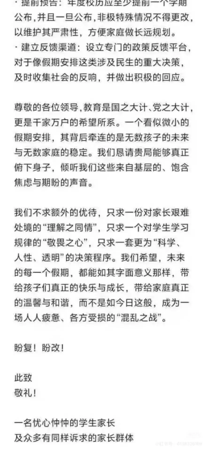 这位家长在文末还写道:“一个看似微小的假期安排,其背后牵连的是无数孩子的未来与无数家庭的稳定。我们恳请贵局能够真正俯下身子,倾听我们这些来自基层的、饱含焦虑与期待的声音。”