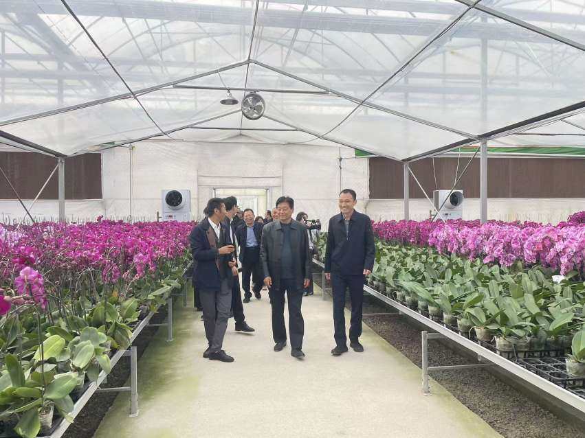 观摩团首站来到全店村村史馆。这里不仅记录着村庄的历史变迁,更承载着浓浓的乡愁记忆。在讲解员的引导下,各位领导与老干部们驻足观看一件件老物件、一幅幅老照片,深刻感受全店村搬迁历程。随后,观摩团一行走进蝴蝶兰种植基地。温室大棚内,一株株蝴蝶兰争奇斗艳、生机盎然。袁新科向观摩团详细介绍了该基地的种植规模、技术管理、市场销售及带动群众就业增收等情况。作为该镇特色农业和产业振兴的亮点项目,蝴蝶兰种植基地不仅提升了土地效益,更成为了群众增收的“美丽经济”。县政协领导对其发展模式表示肯定,希望该镇能继续依托资源优势,做大做强特色产业,为乡村振兴注入更强动力。