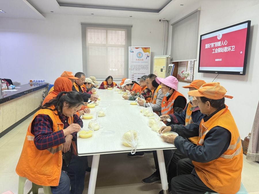 在重阳节到来之际,为弘扬“尊老、敬老、爱老”的传统美德,向长期坚守岗位、默默奉献的环卫一线工人致以节日问候,上街区新安路街道昌盛街社区工会驿站开展“重阳粥到暖人心,工会驿站敬环卫”慰问活动,用一碗热粥传递关怀与敬意。