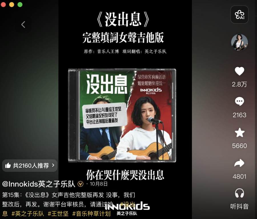 Innokids英之子乐队主理人马超表示,《没出息》这首歌的二创是在原版翻唱基础上,补全了整首歌的旋律并原创了主歌部分的歌词,短短几天内这首歌在抖音账号播放量达到了200多万。而经过官方媒体的转发,这个版本歌曲的全网总播放量超过2亿。