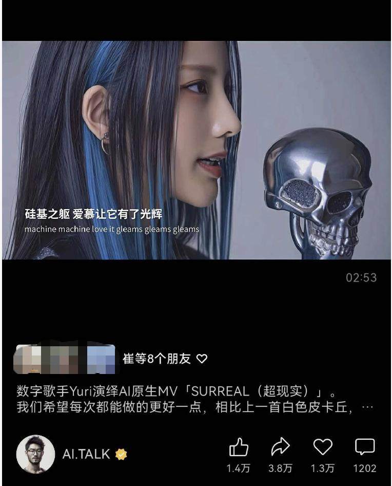今年以来,类似“英之子乐队”这样的AI虚拟偶像迎来全球范围内井喷式爆发。另外一个出圈的案例是,由汗青工作室打造的AI虚拟偶像“YURI”凭借《SURREAL》一曲,全网播放量突破700万次。