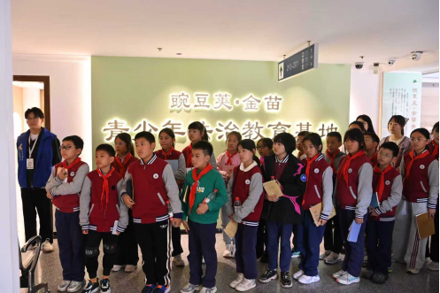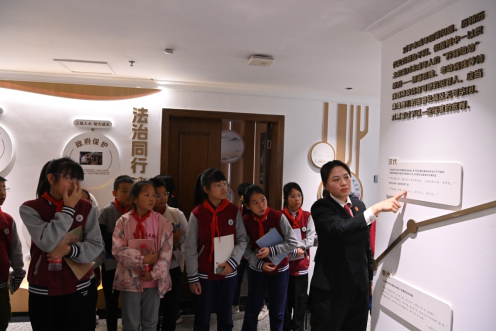 穿越法治长廊,溯源千年法理。“同学们,知道我国古代铸刑于鼎的故事吗?”未成年人与家事案件审判庭的法治宣讲员赵元芳一句提问,瞬间点燃孩子们的好奇心。从刑鼎上的法到现代法庭的庄严,法治普法长廊用四则法制史小故事串联起规则与文明的演进。孩子们跟随宣讲员的脚步,依次探访了“豌豆荚·金苗”青少年法治教育基地的“U型多功能调解室”“心灵绿洲活动室”“圆桌法庭”,在互动中理解调解的温情、心理关怀的细腻,以及审判席上庄严与公平的重量。