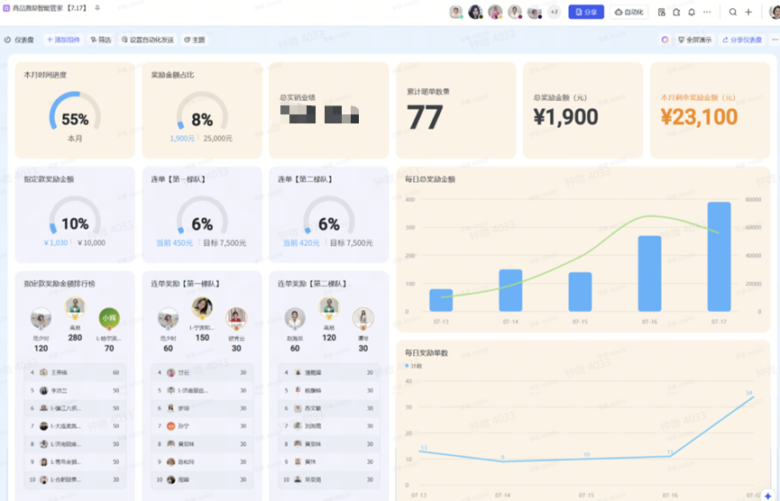 企业每个月的激励方案都可能不同,统计起来费时费力,结果也不能及时公布。管理者很难判断激励金额还剩多少、要不要追加,过去的有效方案也散落各处,难以复用。