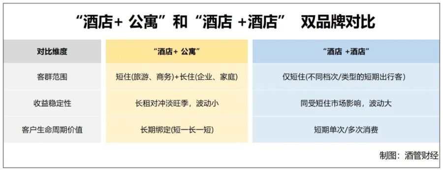 简单来说,“酒店+酒店” 是在同一池子里分蛋糕,而 “酒店+公寓” 是同时挖两个池子的水。