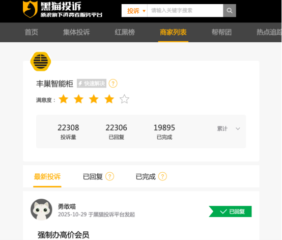 与此同时,C端用户的不满情绪持续累积,成为悬在丰巢头顶的达摩克利斯之剑。据权威消费者投诉平台黑猫投诉数据显示,截至目前,关于丰巢智能柜的投诉量已超过2.2万条,投诉内容高度集中于“强制收费”、“默认投放”、“取件流程繁琐”、“客服响应不及时”等问题。许多用户反映,在未事先征得同意的情况下,快递包裹就被投入丰巢柜并开始计费,若不及时取出便产生费用。虽然丰巢多次声称已优化通知机制,但从不断增长的海量投诉来看,公司的系统执行与用户体验管理仍存在严重漏洞。